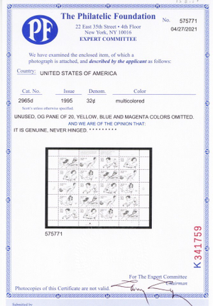 2965d, MNH 32¢ 3 Colors Omitted Major Error Full Sheet PFC Cert - Stuart Katz