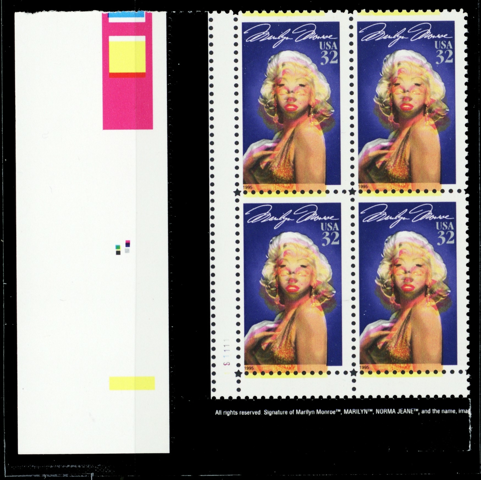 2967, Var, MNH 32¢ Marilyn Monroe Color Shift Error Block - Stuart Katz