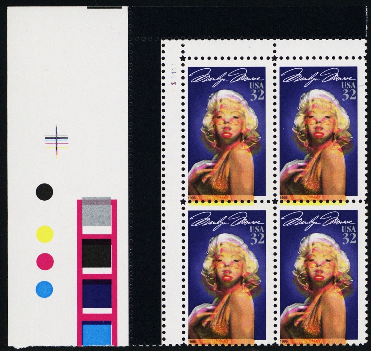 2967, Var, MNH 32¢ Marilyn Monroe Color Shift Error Block -- Stuart Katz