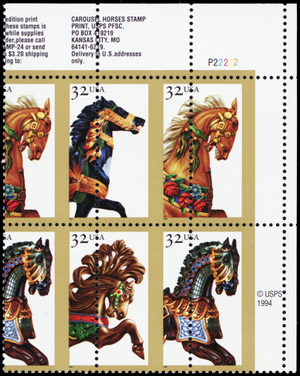 2979a, 32¢ Carousel Horses Misperforation ERROR Plate Block - Stuart Katz