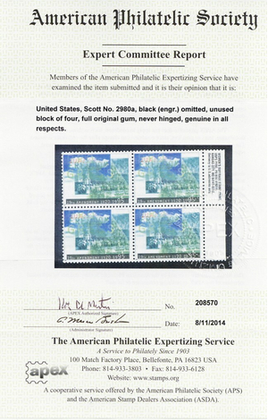 2980a, Mint VF NH Block Black Color Omitted Error APS Cert - Stuart Katz