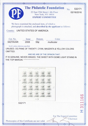 Due to the high cost of obtaining certificates we will only refund the cost of the stamp and not the cost of the certificate for stamps that sell for less than $250 that come back with a negative certificate. Stamps that sell for above $250 will receive a full refund for both the price of the stamp and cost of the certificate if it should come back not as described. For U.S. stamps only certificates from either APS, PSE or from the Philatelic Foundation are accepted, however "graded" certificates or "encased" items are not accepted.