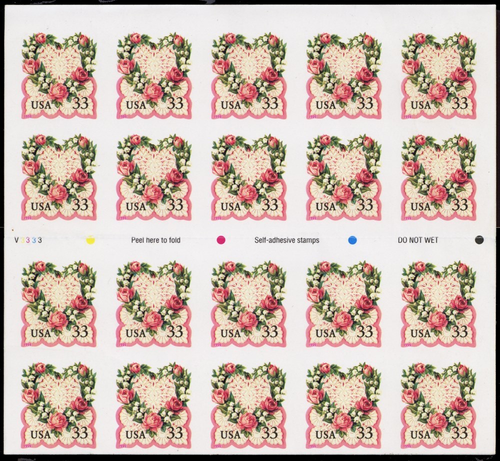 3274b, 33¢ Hearts Complete Imperforate Booklet Pane ERROR - Stuart Katz