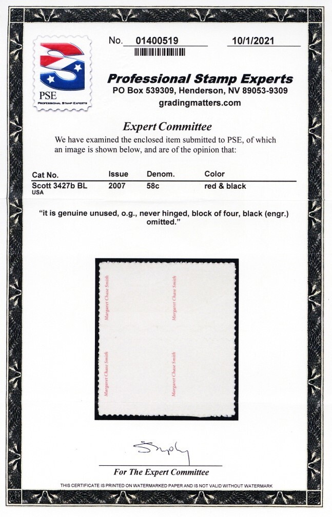 3427b, MNH 58¢ Block - Black Eng Color Omitted PFC Certificate - Stuart Katz