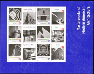 #3910m "MASTERWORKS OF MODERN AMERICAN ARCHITECTURE" ORANGE YELLOW OMITTED ON THE 2ND (DENOMINATIONS) & 4TH (1ST WORD OF BLDG NAMES) VERTICAL ROWS MAJOR ERROR.