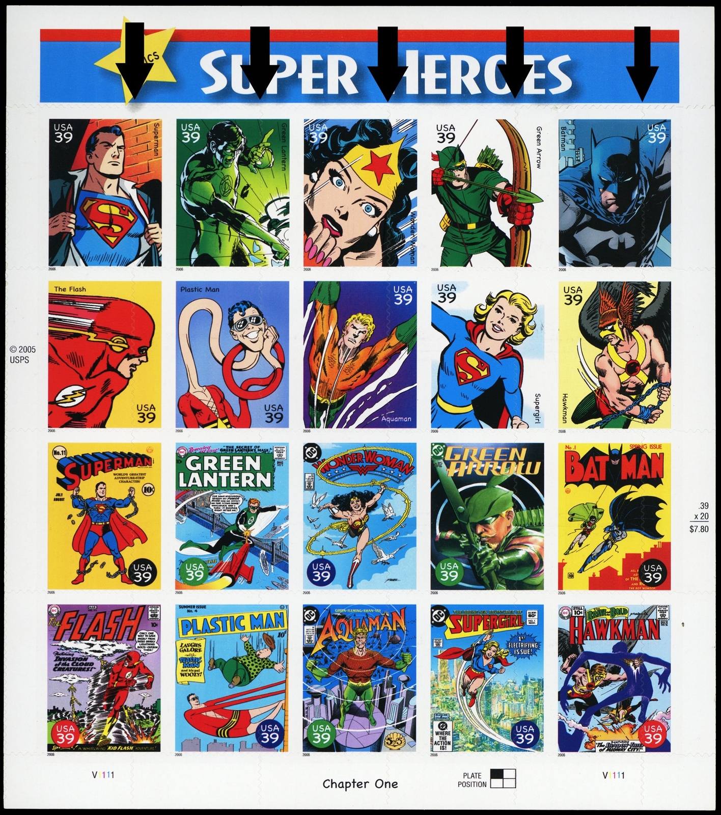 4084, VERY RARE Misperforated Super Heroes ERROR Sheet - Stuart Katz