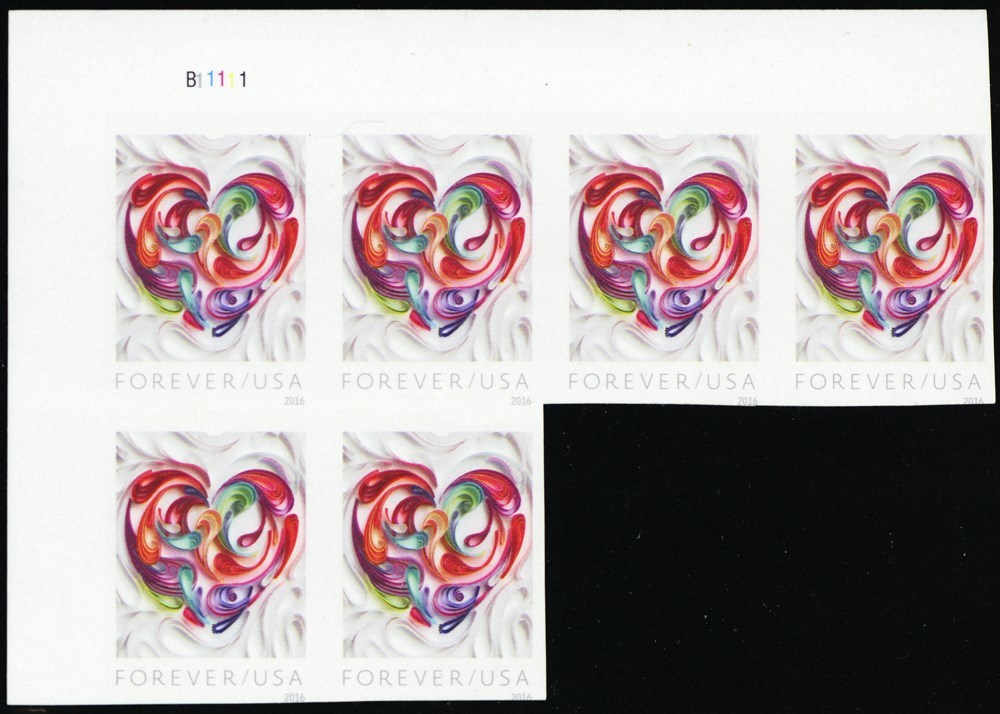 5036 Imperforate Block ERROR Quilted Hearts With PL# B11111 - Stuart Katz