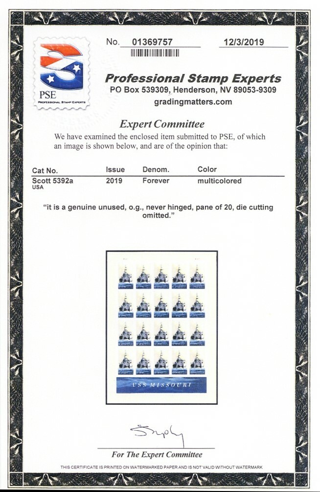 5392a, USS Missouri RARE Imperforate Pair Major Error With PSE - Stuart Katz