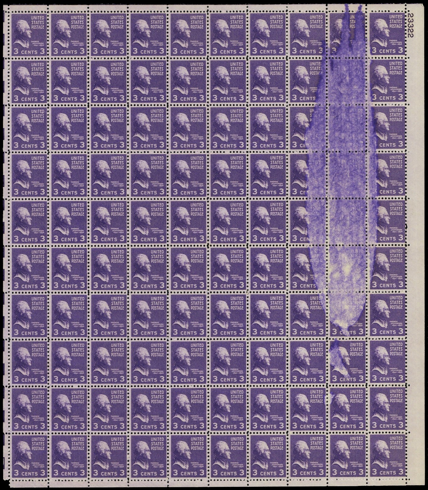 807, Mint NH 3¢ Odd Inking Freak Error - Full Sheet of 100 Stamps - Stuart Katz
