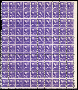 807, MNH 3¢ Misperforated Freak Error - Sheet of 100 Stamps *-* Stuart Katz
