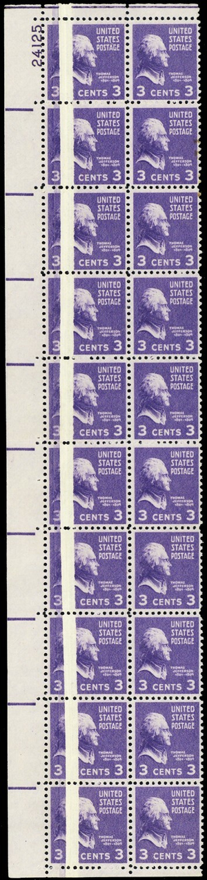 807, MNH 3¢ With Wide Paper Fold Error In Block of 20 Stamps - WoW - Stuart Katz