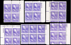 807, Six Misperforation ERROR Plate Blocks 3¢ Prexie Stamps - Stuart Katz