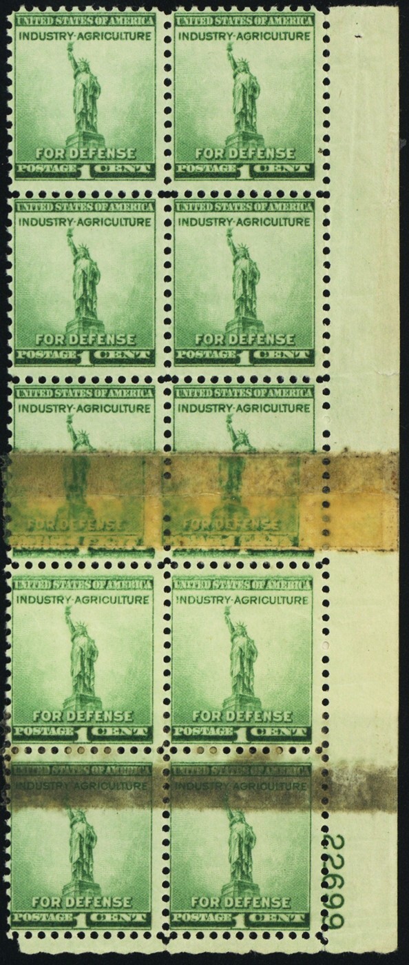 899, MNH 1¢ Double Paper & Tape Slice Freak Error PB of 10 - Stuart Katz