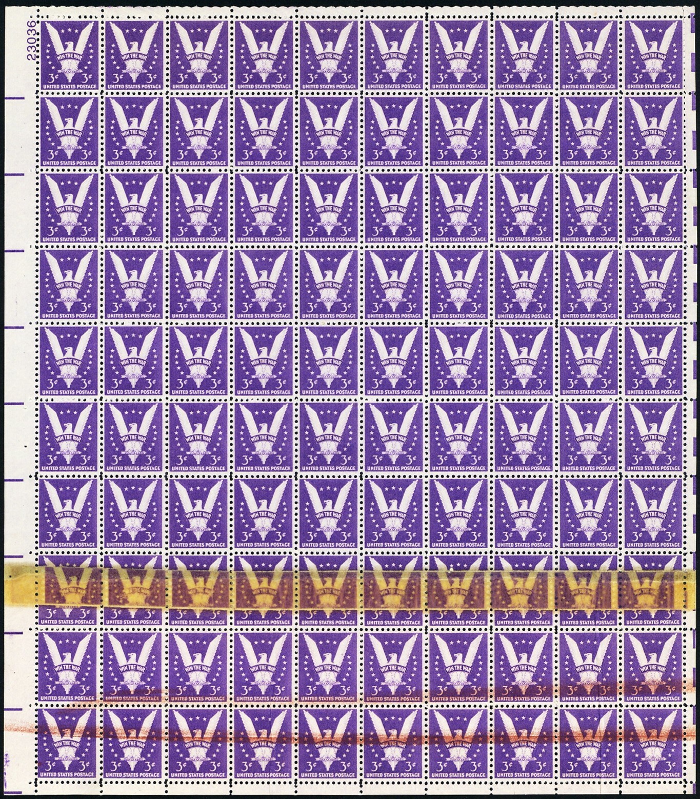 905, MNH 3¢ PO Tape Splice & Rejection Markings Sheet of 100 Error - Stuart Katz