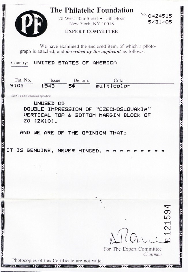 910a, Mint NH 5¢ Double Impression of Czechoslovakia With PFC - Stuart Katz