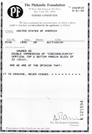 Due to the high cost of obtaining certificates we will only refund the cost of the stamp and not the cost of the certificate for stamps that sell for less than $250 that come back with a negative certificate. Stamps that sell for above $250 will receive a full refund for both the price of the stamp and cost of the certificate if it should come back not as described. For U.S. stamps only certificates from either APS, PSE or from the Philatelic Foundation are accepted, however "graded" certificates or "encased" items are not accepted.