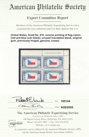 Due to the high cost of obtaining certificates we will only refund the cost of the stamp and not the cost of the certificate for stamps that sell for less than $250 that come back with a negative certificate. Stamps that sell for above $250 will receive a full refund for both the price of the stamp and cost of the certificate if it should come back not as described. For U.S. stamps only certificates from either APS, PSE or from the Philatelic Foundation are accepted, however "graded" certificates or "encased" items are not accepted.