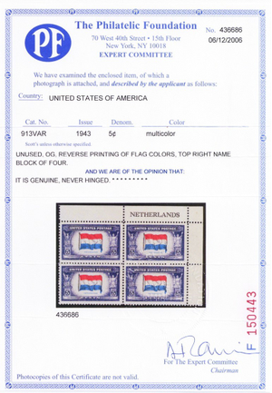 913a, MNH 5¢ Name Block Reverse Printing of Flag Colors With PFC - Stuart Katz