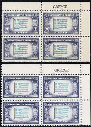 916a, Mint NH VF Reverse Printing of Flag Colors Name Block * Stuart Katz