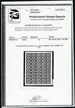 Due to the high cost of obtaining certificates we will only refund the cost of the stamp and not the cost of the certificate for stamps that sell for less than $250 that come back with a negative certificate. Stamps that sell for above $250 will receive a full refund for both the price of the stamp and cost of the certificate if it should come back not as described. For U.S. stamps only certificates from either APS, PSE or from the Philatelic Foundation are accepted, however "graded" certificates or "encased" items are not accepted.