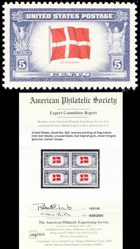 920a, MNH 5¢ Denmark Reverse Printing of Flag Colors With APS Cert - Stuart Katz