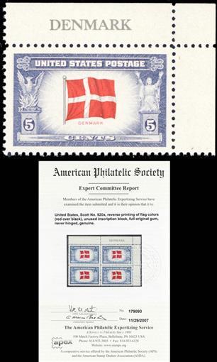 920a, MNH 5¢ Denmark Reverse Printing of Flag Colors With APS Cert - Stuart Katz