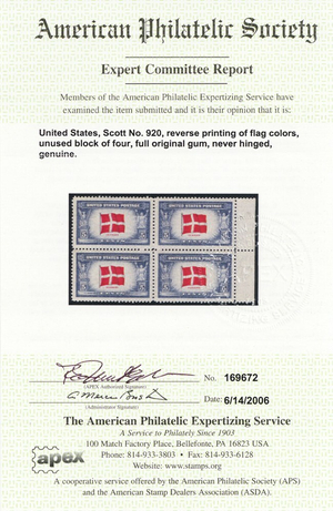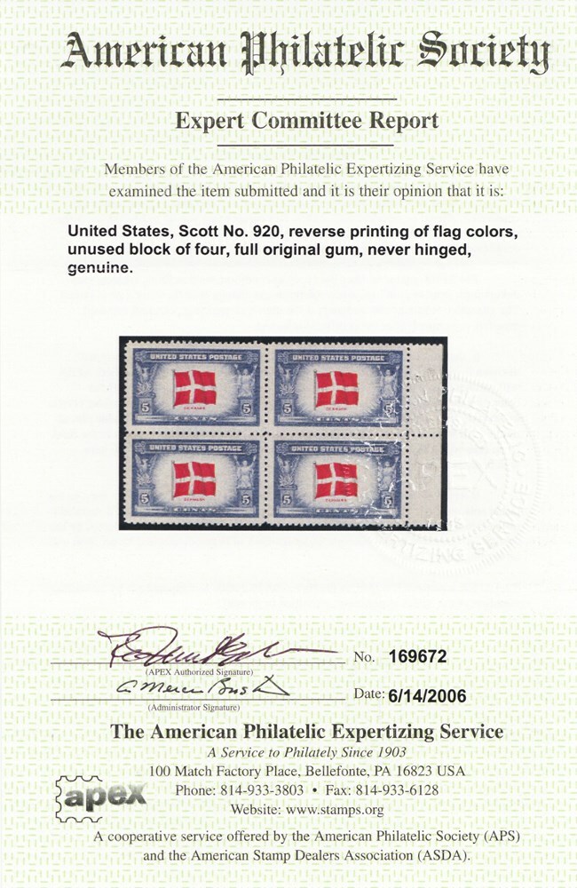920a, Reverse Printing of Flag Colors VF NH With APS Certificate --- Stuart Katz