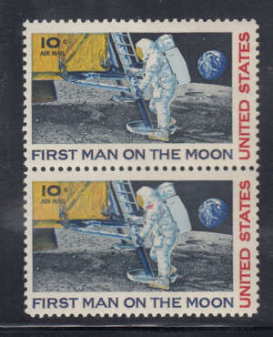 Most of the red lithograph ink is missing, but if you take a close look at the stamp under strong magnification, you'll notice a couple faint red dots on the shoulder where the flag should be and on the visor. There are some red dots in the yellow part of the landing capsule that gradually fade toward the right. Unfortunately, this stamp doesn't meet the criteria for the $550 error, but the next one over likely did, making this a lovely 'poor man's copy' of this difficult error.