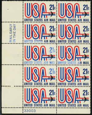 C81, MNH 21¢ Large Blue Ink Smear Freaky Error PL# Block/10 Stamps - Stuart Katz