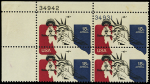 C87, 18¢ Statue of Liberty HUGE Color Shift ERROR Plate Block - Stuart Katz