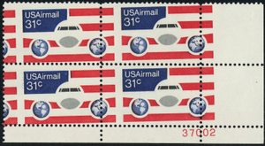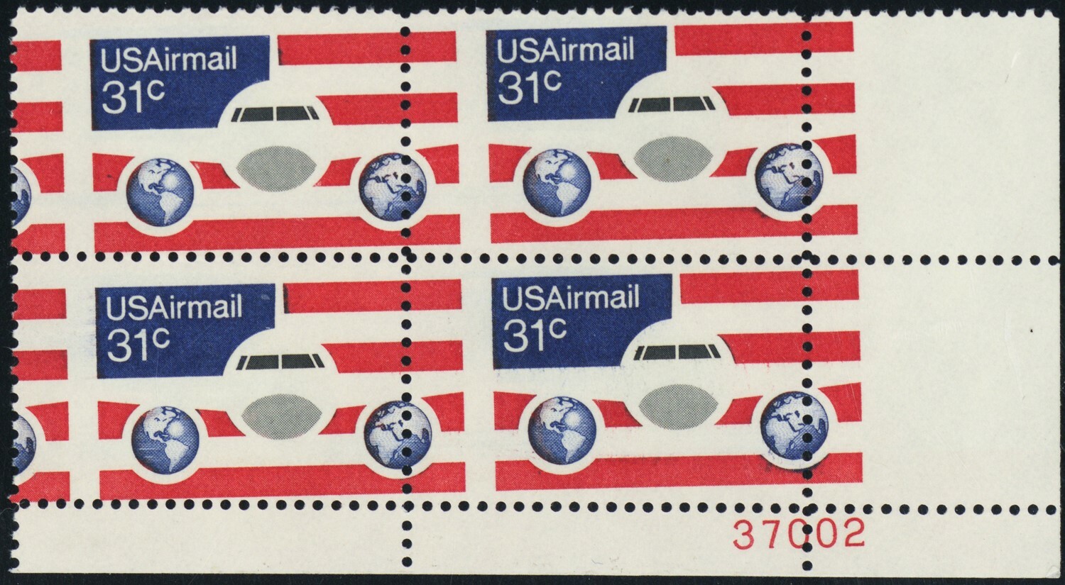 C90, MNH 31¢ Misperfed Error Plate Block of Four Airmail Stamps - Stuart Katz