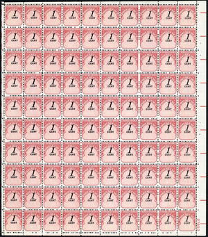 J89, MNH 1¢ Shifted Up Full Sheet of 100 Error Stamps - Stuart Katz