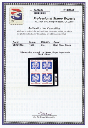 O148, Mint NH 23¢ Imperforate Block of Four (Printers Waste) PSE - Stuart Katz