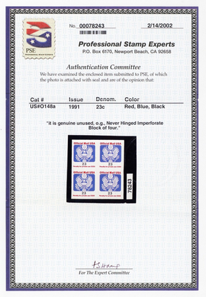 Due to the high cost of obtaining certificates we will only refund the cost of the stamp and not the cost of the certificate for stamps that sell for less than $250 that come back with a negative certificate. Stamps that sell for above $250 will receive a full refund for both the price of the stamp and cost of the certificate if it should come back not as described. For U.S. stamps only certificates from either APS, PSE or from the Philatelic Foundation are accepted, however "graded" certificates or "encased" items are not accepted.