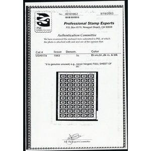 917a, MNH 5¢ Reverse Printing of Flag Colors Sheet With PF Cert - Stuart Katz