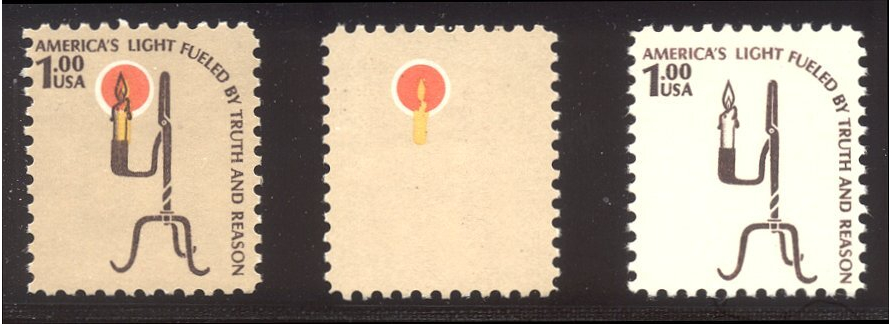 Scott #1610a & b: 1979 $1 Candlestick, Colors Omitted Centering & Condition: Mint. Fresh. Very Fine group. The left one is normal Reverse (Gum Side): Original gum. Never Hinged.. Faults / Imperfections: None The item pictured is the actual item you are purchasing, unless otherwise noted. I also offer an interest-free layaway plan. Ask me about it!" All items will be mailed a day or two after payment is received. ![]() ![]() ![]() --------------------------------------------------------------------------------