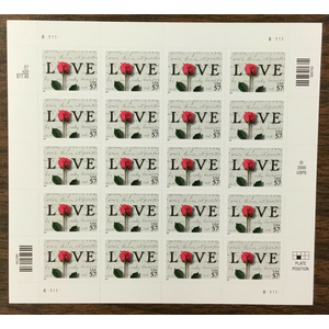 Rose and Love Letter Sheet of 20 Stamps - 57 Cent Postage Stamps Scott 3551