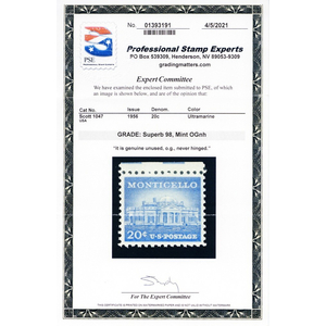 1047, Mint Superb 20¢ With Graded 98 PSE Certificate Stuart Katz