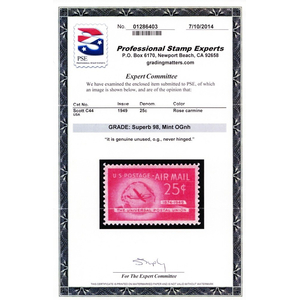 C44, Mint NH Superb 25¢ With Graded 98 PSE Certificate Stuart Katz