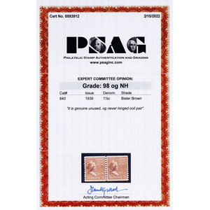 840, Mint Superb NH 1-1/2¢ PAIR With PSAG Graded 98 Certificate * Stuart Katz