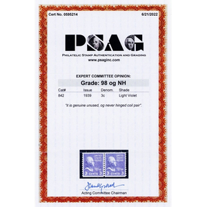 842, Mint Superb NH 3¢ PAIR With PSAG Graded 98 Certificate * Stuart Katz