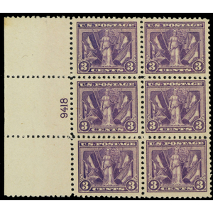 537, Mint F/VF LH 3¢ Top Plate Block of Six Stamps * Stuart Katz