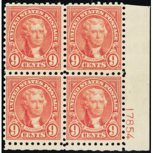 590, VF LH 9¢ Fresh Plate Block of Four Stamps Cat $150.00 - Stuart Katz