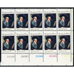 1553, Misperfed ERROR Plate Block of 10 10¢ Benjamin West Stamps - Stuart Katz