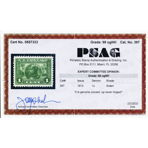 397, Mint Superb NH 1¢ - With PSAG Graded 98 Certificate * Stuart Katz