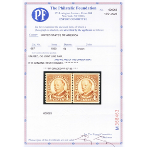 687, Mint NH VF/XF Coil Line Pair - PFC Graded 85 Certificate ** Stuart Katz