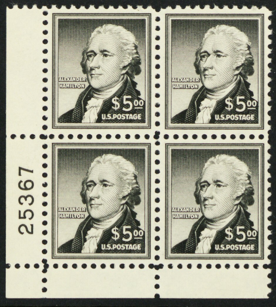 1053, Mint VF NH $5 Hamilton Plate Block -- Stuart Katz