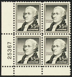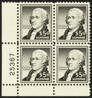 1053, Mint VF NH $5 Hamilton Plate Block *---* Stuart Katz