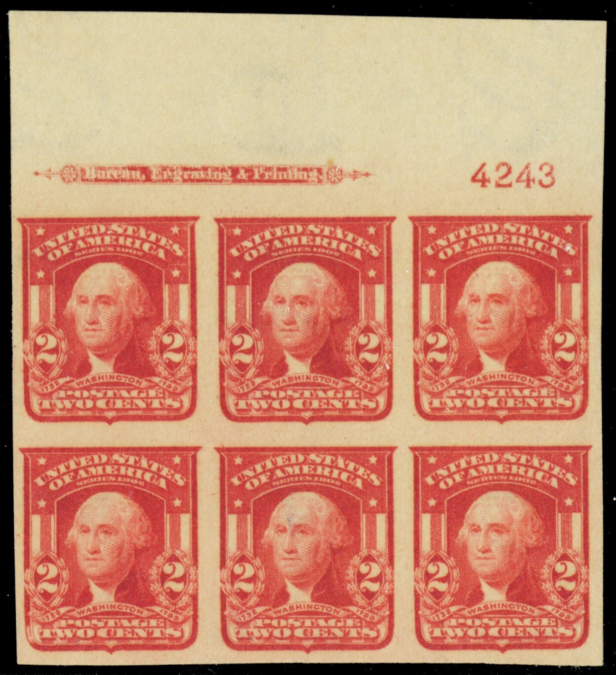 320, Mint VLH 2¢ Top Margin Plate Block of Six * Stuart Katz