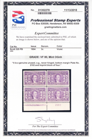 325, Mint NH VF 3¢ Plate Block of Four With Graded PSE Certificate - Stuart Katz